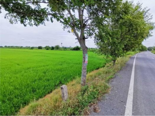 ที่ดินติดถนนลาดยาง หน้ากว้างด้านติดถนนประมาณ 82 เมตร ยาวประมาณ 705 เมตร ด้านหลังกว้างประมาณ 200 เมตร ปัจจุบันปลูกข้าว ระดับของที่ดินต่ำกว่าถนนประมาณ 1 เมตร