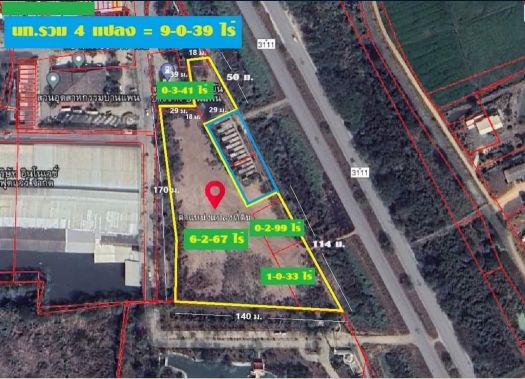•ขนาดพื้นที่: ด้านซ้ายติดถนนกว้าง 114 ม., ด้านขวาติดถนนกว้าง 50 ม., ด้านหลังติดที่ดินโรงงานกว้าง 170 ม.