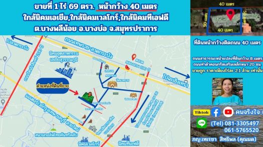 ขายที่ดิน 1 ไร่ 69 ตรว.หน้ากว้างติดถนน 40 เมตร หมู่ 10  ต.บางพลีน้อย อ.บางบ่อ จ.สมุทรปราการ