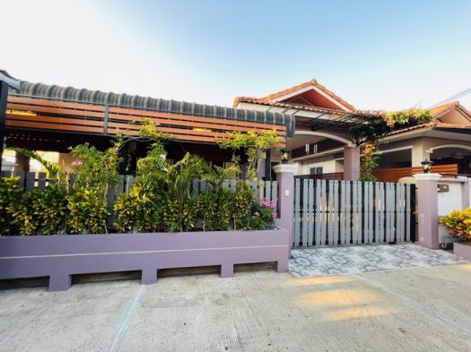 รอบบ้านตกแต่งสวนดอกไม้ พร้อมระแนงดอกพวงชมพูบานสะพรั่งข้างบ้าน ช่วยให้บ้านเย็น พร้อมเก้าอี้ไม้สักแท้ นั่งเล่นทานกาแฟ หน้าบ้าน