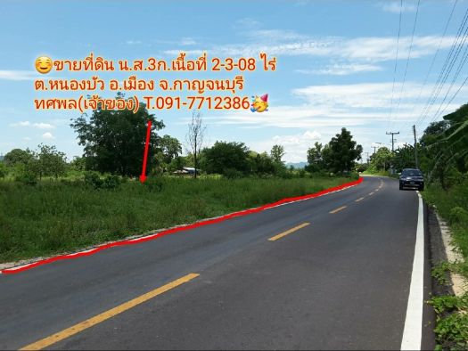 ที่ดินเปล่าถมแล้ว น.ส.3ก เนื้อที่ 2-3-08 ไร่ สวย ทำเลดี อยู่ในแหล่งเจริญ ไฟฟ้า ประปา ติดถนนเมนหนองบัว-ลาดหญ้า อ.เมือง จ.กาญจนบุรี ราคาไร่ละ 2,400,000 บาท เจ้าของเอง ติดต่อ ทศพล 091-7712386
