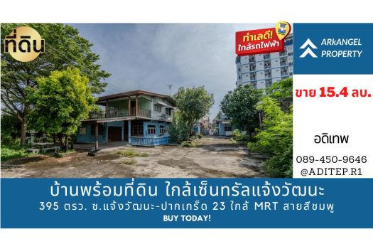 ขายพร้อมผู้เช่าระยะยาว ที่ดินพร้อมสิ่งปลูกสร้าง 395 ตรว. ตรงข้ามเซ็นทรัลแจ้งวัฒนะ ในซอยแจ้งวัฒนะ-ปากเกร็ด 23 ใกล้สถานีรถไฟฟ้าสายสีชมพู เข้าซอย 650 เมตร