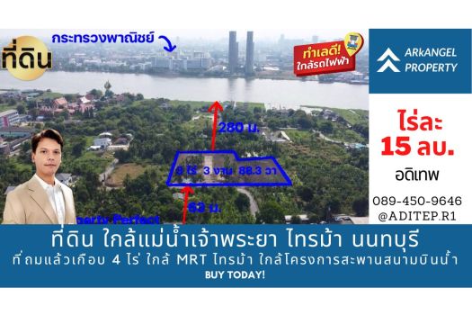 ขายที่ดิน ใกล้แม่น้ําเจ้าพระยา ซ.ไทรม้า 5 นนทบุรี ที่ถมแล้วเกือบ 4 ไร่ ใกล้รถไฟฟ้า ใกล้โครงการสะพานสนามบินน้ำตัดเชื่อมไปออกถนนราชพฤกษ์ในอนาคต