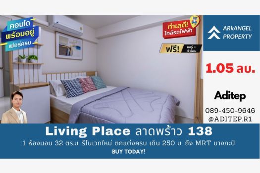 ขายคอนโดราคาล้านต้นๆ Living Place ลาดพร้าว 138 ขนาด 1 ห้องนอน 32 ตร.ม รีโนเวทใหม่พร้อมอยู่ ใกล้เดอะมอลล์บางกะปิ ใกล้ MRT เดินได้ 250 เมตร
