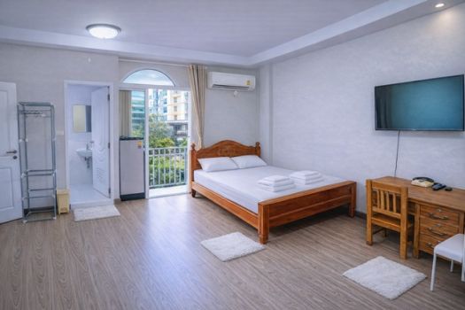 เตียง ตู้เสื้อผ้า ทีวี ตู้เย็น ห้องน้ำส่วนตัว