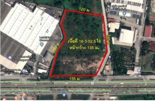 พื้นที่ติดถนน พระราม 2 หน้ากว้าง ด้านหน้า 135 เมตร ด้านหลัง 120 เมตร ลึก 195-220 เมตร