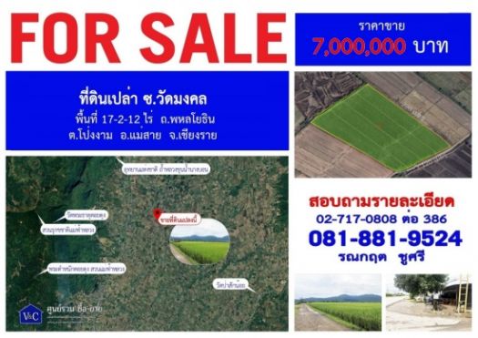 {SALE} ที่ดินเปล่า ซ.วัดมงคล พื้นที่ 17-2-12 ไร่ ถ.พหลโยธิน ต.โป่งงาม อ.แม่สาย จ.เชียงราย