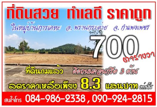ขายถูก ที่ดินถมแล้วในหมู่บ้านการเคหะ 700 ตารางวา ติดถนนคอนกรีต 3 ด้าน (หมู่บ้านรัชฏาภรณ์) ต.พรานกระต่าย อ.พรานกระต่ายจ.กำแพงเพชร ที่ดินเป็นรูปสี่เหลี่ยมผืนผ้า ติดถนนคอนกรีต 3 ด้าน สวยมาก ที่ดินอยู่ใกล้ชุมชน การคมนาคมสะดวก ถนนทางเข้า-ออกเป็นถนนคอนกรีตสาธารณะ กว้าง 10 เมตร ไฟฟ้า-น้ำประปาเข้าถึง เป็นที่ถมแล้วเหมาะสำหรับสร้างที่อยู่อาศัย และทำธุระกิจทางด้านที่พักอาศัย ประเภท ห้องเช่า ห้องพักหรือรีสอร์ท แบบชั่วคราว รายวันและรายเดือน อยู่ห่างตัวอำเภอพรานกระต่าย 5 กิโลเมตรและอยู่ห่างจากศาลากลางจังหวัดกำแพงเพชร เพียง 15 ก.ม.เท่านั้น ที่ดินสวย ทำเลดี การคมนาคมสะดวก พิเศษ ขายยกแปลง 700 ตารางวาราคาเพียง 830,000 บาทเท่านั้น มีให้เลือก 3 แปลง สนใจ โทร 084-986-2338 , 090-924-2815