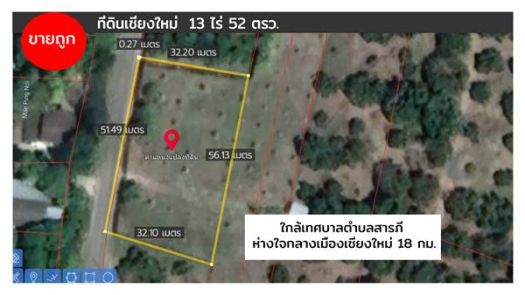 ราคาถูก ที่ดินเชียงใหม่ อ.สารภี โฉนดที่ดิน เนื้อที่ 13-0-52 ไร่ หน้ากว้างติดถนนสาธารณะ