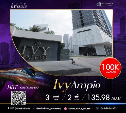 ให้เช่า คอนโด Ivy Ampio รัชดา - พระราม 9 135.98 ตรม. ห้อง Duplex Penthouse 3 ห้องนอน 2 ห้องน้ำ ชั้นสูง ห้องดีมาก ทำเลย่านรัชดา