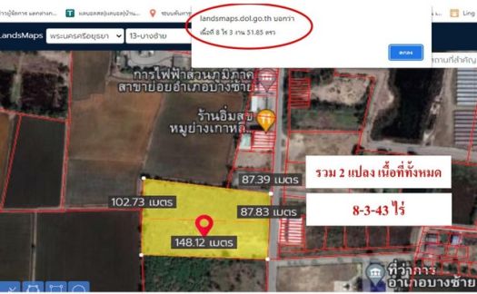 ขาย ที่ดินเปล่า ถมแล้ว (8-3-43 ไร่) ในพื้นที่ทำเลทอง อ.บางซ้าย จ.พระนครศรีอยุธยา อยู่เยื้องกับ ที่ว่าการอำเภอบางซ้าย