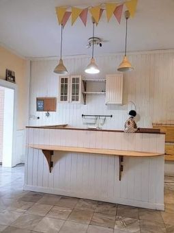 ชั้นล่างตกแต่งเป็นร้านกาแฟ หลังบ้านมีชุดครัว build in เปิดโล่ง สามารถวางโต๊ะเตรียมทำขนม เตาอบได้