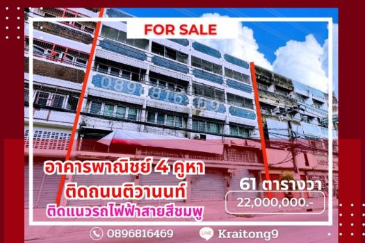 ขายอาคารพาณิชย์ ขายตึกแถว 4 คูหา ติดถนนติวานนท์ ติดแนวรถไฟฟ้าสีชม