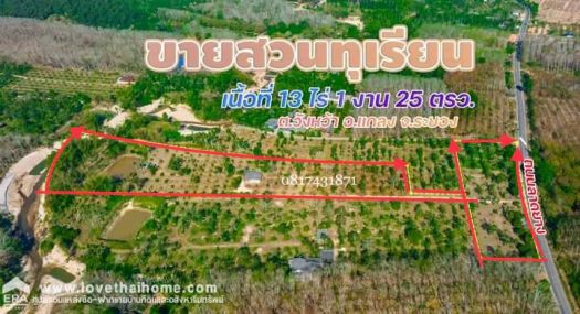 ขายที่ดินพร้อมสวนทุเรียน เมืองแกลง ระยอง พื้นที่13-1-25 ไร่ ติดถนนลาดยาง มีบ่อน้ำ มีผลผลิตแล้ว ทำท่องเที่ยวเชิงเกษตร บุฟเฟ่ต์ทุเรียน ทำเลดี ขายไม่แพง