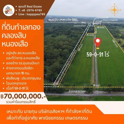 ที่ดินคลองสิบ หนองเสือ ปทุมธานี เนื้อที่ 59 ไร่ ผังสีชมพู ทำเลทอง อยู่ติดหลัง ที่ว่าการ อ.หนองเสือ , สภ.หนองเสือ