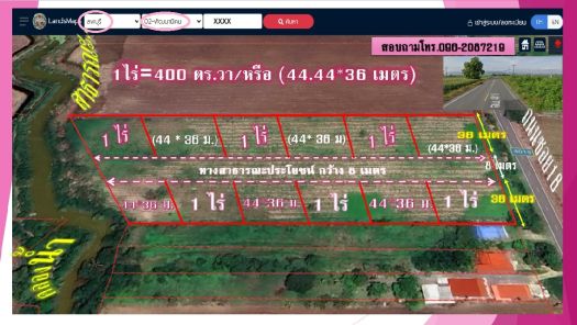 โฉนดครุฑแดง จัดแปลงละ 1, 2, 3,...ไร่ หน้ากว้างติดถนนสาธารณะ (44.44*36 เมตร)