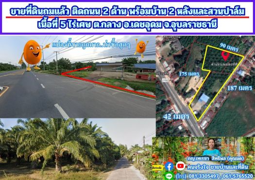 ขายที่ดินถมแล้ว ติดถนน 2 ด้าน พร้อมบ้าน 2 หลังและสวนปาล์ม เนื้อที่ 5 ไร่เศษ ต.กลาง อ.เดชอุดม จ.อุบลราชธานี